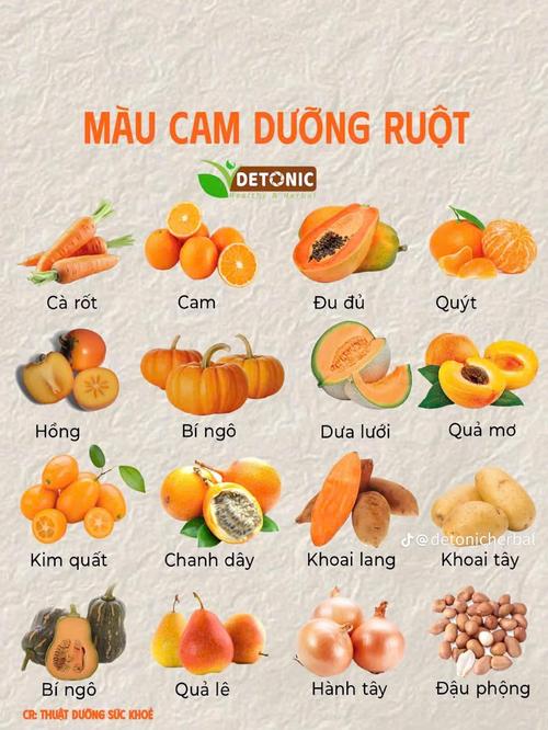 - Củ: Cà rốt, bí đỏ, khoai lang cam.