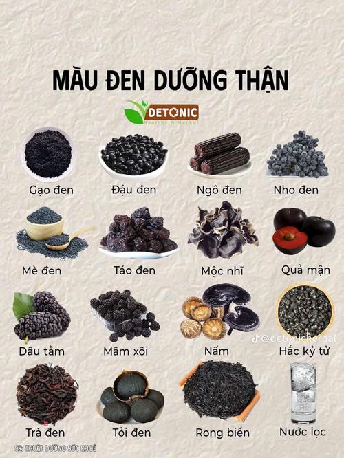 - Khác: Mè đen, đậu đen, gạo đen, nấm mèo (mộc nhĩ).